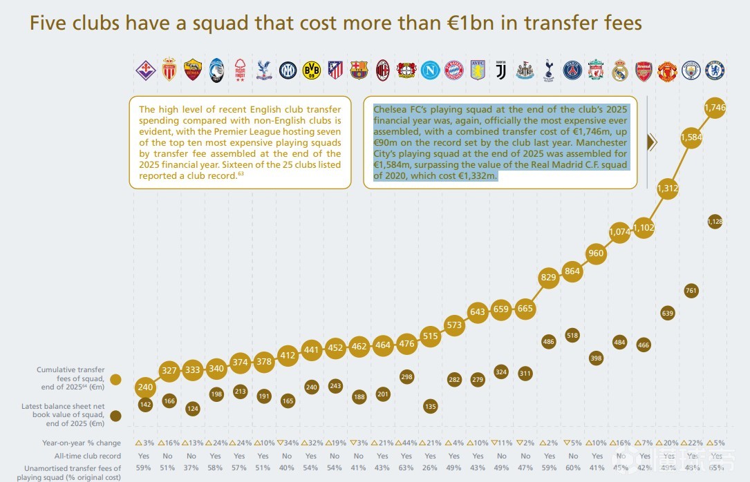 “截至2025财年,切尔西的一线队阵容以17.46亿欧元的累计转会成本,正式成为历史上组建成本最高的阵容,比俱乐部去年创下的纪录高出9000万欧元。”