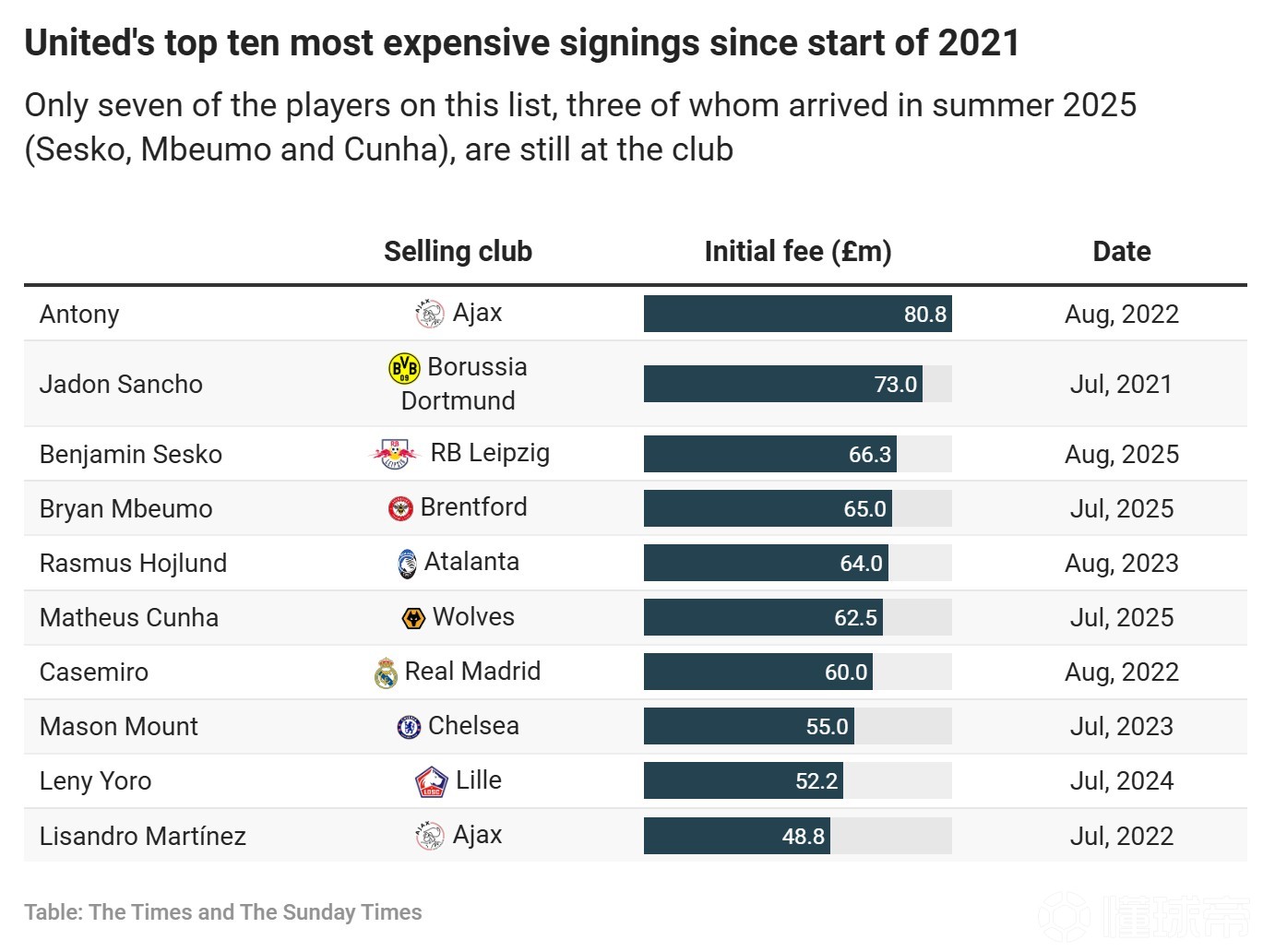 泰晤士报:曼联过去五年净转会支出全球第一,总额约6.92亿英镑