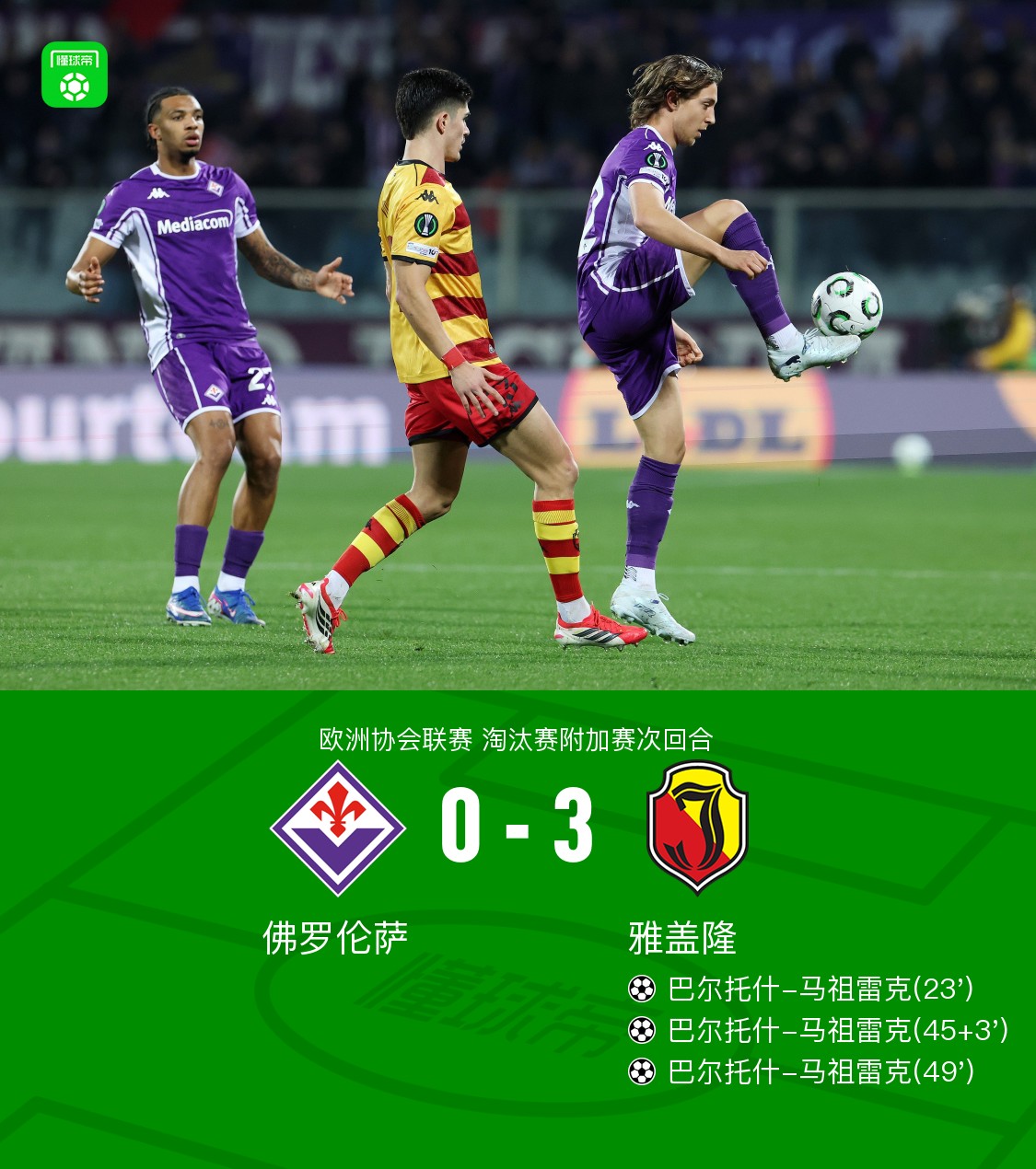 北京时间2月27日欧洲协会联赛 淘汰赛附加赛次回合,佛罗伦萨对阵雅盖隆。雅盖隆巴尔托什-马祖雷克帽子戏法。常规时间双方0-3战平,将进入加时赛。两回合总比分佛罗伦萨3-3雅盖隆。