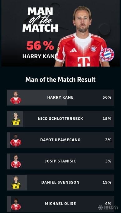 梅开二度助球队逆转,凯恩当选多特vs拜仁全场最佳球员